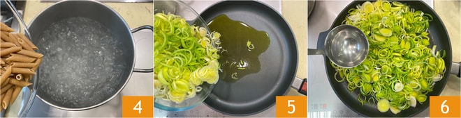 Cuece la pasta en abundante agua hirviendo con sal 4 durante el tiempo indicado en el paquete. En una sartén, vierte el aceite, añade los puerros 5 y un cazo de agua de la cocción de la pasta 6. Cocina durante 10 minutos.