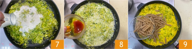 Vierte en la sartén la nata de soja 7 y continúa la cocción durante otros 5 minutos. Disuelve los sobres de azafrán con un cazo de agua de la cocción de la pasta, añádelo a los puerros 8 y mezcla. Escurre la pasta al dente y transfiérela a la sartén 9.