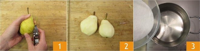 Para preparar las peras cocidas, empezad pelándolas enteras con un pelador 1, cuidando de dejar el rabito adherido 2. Ahora preparad el almíbar: verted en una cazuela el agua y el azúcar 3.