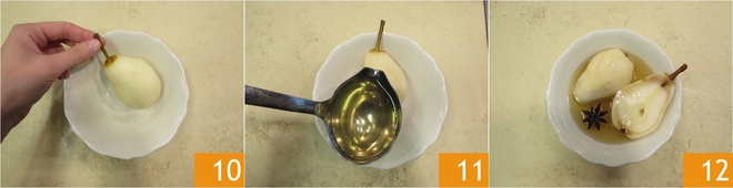 Ahora emplatad: colocad una pera en un cuenco 10, verted por encima un cucharón de almíbar 11 y servidlas 12. Si preferís, podéis añadir una pizca de canela en polvo.