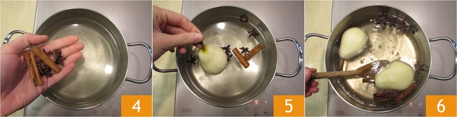 Añadid el anís y la canela 4 y llevad a ebullición. En cuanto empiece a hervir, bajad el fuego y mantenedlo a media potencia. Introducid las peras 5 y dejadlas cocer durante 10/15 min, cuidando de girarlas de vez en cuando para que se cocinen de manera uniforme 6.