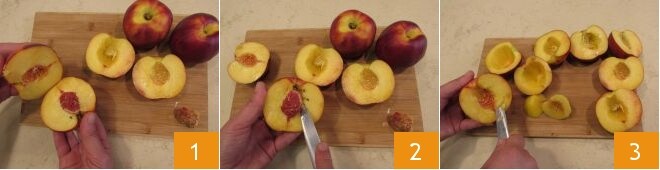 Para preparar los melocotones rellenos al horno, empieza lavando y secando los melocotones. Divide cada melocotón por la mitad 1, luego con un cuchillo pequeño elimina el hueso 2. También cava un poco la pulpa alrededor del hueco del hueso 3. Reserva los melocotones.