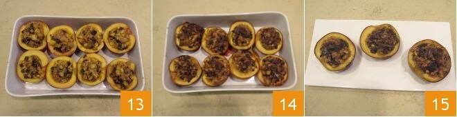 Mezcla los ingredientes 10 ayudándote con un tenedor. Luego añade también el chocolate 11 y mezcla este último con los ingredientes. Finalmente, coloca en una fuente para horno ligeramente enmantecada los melocotones uno junto al otro con el hueco hacia arriba, preferiblemente sin dejar espacios. Rellénalos con algunas cucharadas del relleno, dando al relleno la forma de una pequeña cúpula 12.