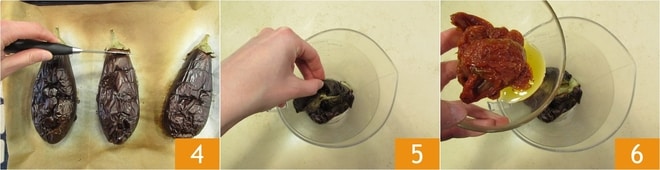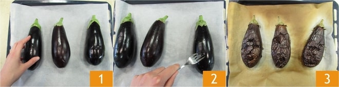 Para preparar el pesto de berenjenas rústico, comienza con la cocción de las berenjenas, colócalas en una bandeja con papel de horno 1 y pínchalas por toda la superficie con un tenedor 2 para facilitar su cocción. Cocina en horno estático precalentado a 250° durante 45 min. Cuando estén listas, sácalas del horno 3.