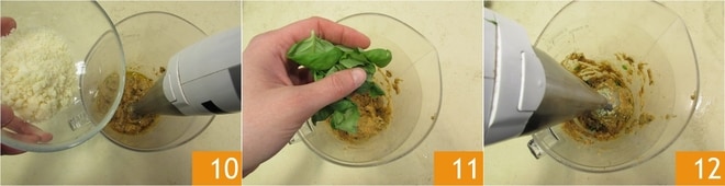 Añade entonces el parmesano 10 y la albahaca 11 y da una rápida triturada para dejar la mezcla gruesa 12.
