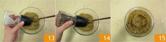 Finalmente ajusta de sal 13 y pimienta 14 y mezcla con una cuchara. ¡Tu pesto de berenjenas rústico está listo 15!