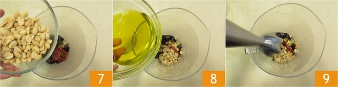 Añade también los cacahuetes 7, el aceite 8 y tritura durante unos segundos con una batidora de inmersión 9.