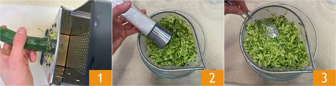Para preparar el pesto de calabacín y almendras, primero lava y corta los extremos de los calabacines, luego rállalos con un rallador de orificios grandes 1. Traslada los calabacines a un colador, sálalos 2 y aplástalos con una cuchara. Deja reposar los calabacines durante 20 minutos para eliminar el líquido de vegetación 3.