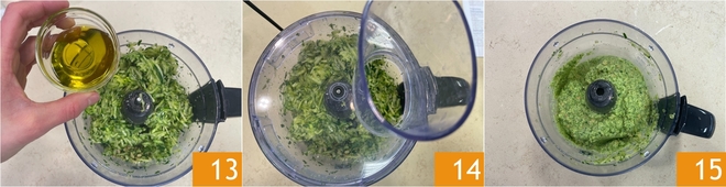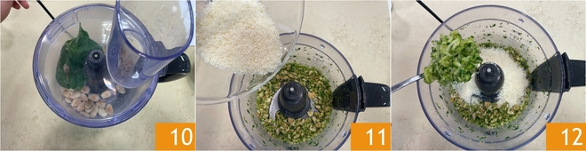 Tritura 10 hasta obtener una consistencia gruesa. Añade ahora el Parmigiano Reggiano rallado 11 y los calabacines escurridos 12.