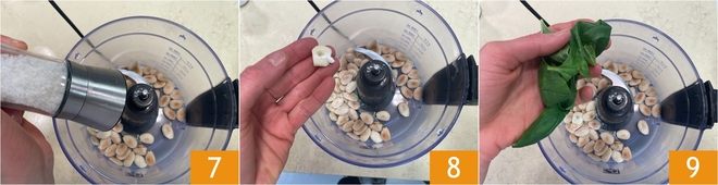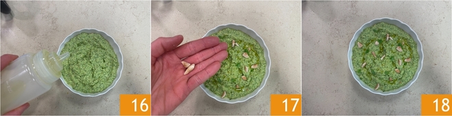 Finaliza el pesto con un chorrito de aceite de oliva virgen extra 16 y las almendras reservadas 17. ¡Tu pesto de calabacín y almendras está listo para servir 18!