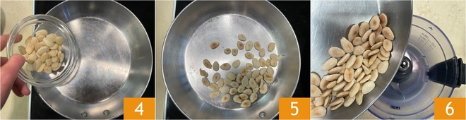 Mientras tanto, echa en una sartén caliente las almendras peladas 4 y tuéstalas a fuego medio durante unos 7 minutos, removiendo con frecuencia para que no se quemen 5. Pasa las almendras tostadas a un robot de cocina con cuchillas 6, cuidando de reservar algunas para la decoración.