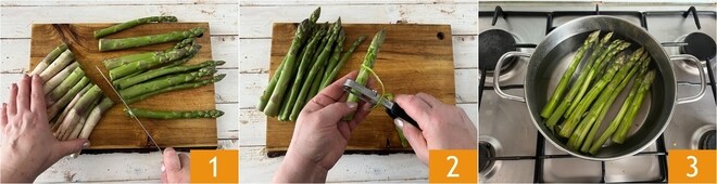 Para hacer el pesto de espárragos, lo primero es empezar con la limpieza. Eliminad las extremidades más leñosas 1 y pelad la parte restante del tallo, dejando las puntas intactas 2. En total necesitaréis unos 220 g de espárragos limpios. Escaldad los espárragos en agua salada durante unos 10 minutos 3.
