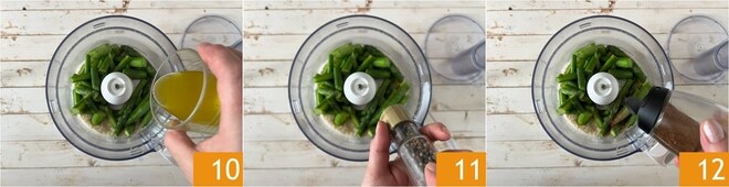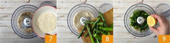 Añadid el Parmigiano Reggiano DOP y el Pecorino rallados 7 y triturad de nuevo durante unos instantes. Añadid ahora los espárragos 8 y unas gotas de zumo de limón 9.