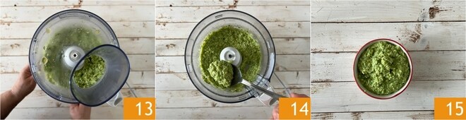 Cerrad el procesador de alimentos y triturad a intervalos 13, para no calentar la mezcla. Tan pronto como obtengáis una consistencia cremosa y rústica 14, el pesto de espárragos está listo para usar 15.