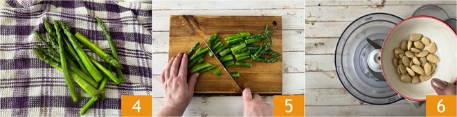 Escurrid los espárragos, secadlos con un paño 4 y cortadlos en trozos 5. Verted las almendras en un procesador de alimentos 6 y trituradlas groseramente.