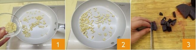 Para preparar el pesto de remolacha, comenzad tostando los piñones. Vertedlos en la sartén 1 y salteadlos continuamente a fuego alto, asegurándoos de que no se quemen 2; una vez dorados, reservadlos. Mientras tanto, cortad las remolachas en trozos 3,