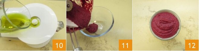 Cerrad el robot y accionad las cuchillas vertiendo el aceite en hilo 10, batid hasta obtener una crema lisa y homogénea 11. Pasadla a un bol y ya está listo vuestro pesto de remolacha 12 para ser usado como condimento para la pasta o para servir sobre crujientes tostadas!