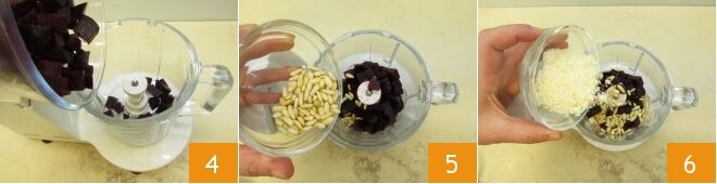 y verted también la remolacha en la batidora 4 junto con los piñones 5. Añadid también el Parmesano rallado 6,