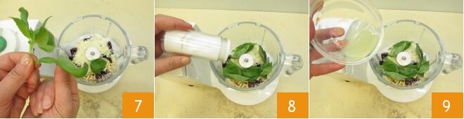 las hojas de albahaca 7, una pizca de sal 8 y el jugo de medio limón 9.