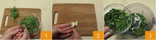 Para preparar el pesto de mejorana, comienza lavando y secando la mejorana, luego desprende todas las hojitas de la ramita 1; después pela el ajo, córtalo por la mitad y quítale el germen, que es la parte central y tiene un sabor muy intenso 2. En el procesador de alimentos, echa las hojitas de mejorana 3.