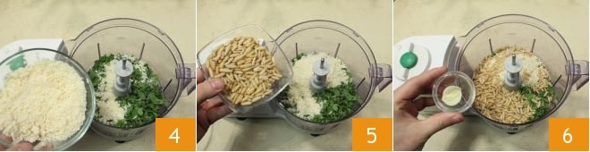 Luego añade el queso rallado 4, los piñones 5 y también el diente de ajo previamente cortado por la mitad y sin el germen 6,