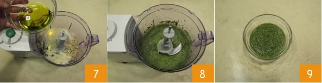 finalmente vierte el aceite de oliva virgen extra y la sal 7 y mezcla hasta obtener una salsa homogénea 8. Traslada el pesto de mejorana a un recipiente y úsalo de inmediato 9.