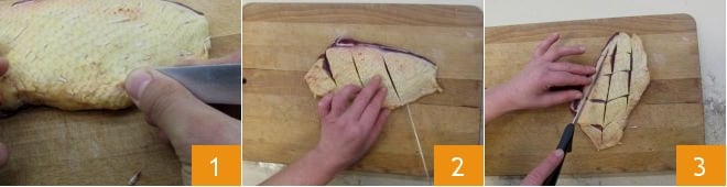 Para preparar la pechuga de pato lacada a la naranja eliminad las pequeñas plumas que quedan adheridas a la piel de las pechugas de pato con unas pinzas de cocina 1. Haced incisiones en las pechugas por el lado de la piel realizando 3 cortes en diagonal 2 y 4 transversales para crear unos rombos 3.