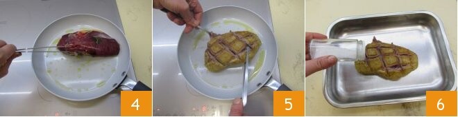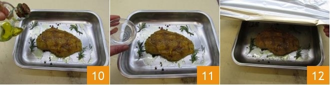 las hojas de romero, el aceite 10 y finalmente verted el agua en el fondo de la bandeja 11. Cubrid con una hoja de aluminio 12 y coced en horno estático precalentado a 160° durante 30-40 minutos (o a 130° durante 20-30 minutos si es horno ventilado).