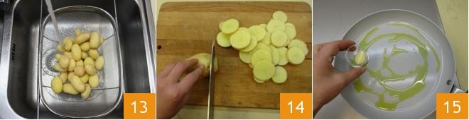 Mientras tanto, preparad las patatas: lavad las patatas nuevas bajo abundante agua fresca corriente 13. Con un cuchillo o una mandolina cortadlas en rodajas de 2-3 mm de grosor sin quitar la piel 14, poniendo a medida que las cortáis en un recipiente con agua para que no se oscurezcan. Una vez terminado, dorad un diente de ajo pelado con un poco de aceite en una sartén antiadherente 15, luego escurrid las patatas y secadlas con un paño limpio.