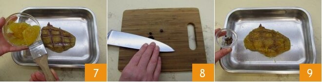 Poned la mermelada de naranjas en un cuenco pequeño y luego barnizad la piel de las pechugas, cubriéndolas de manera uniforme 7. Con el dorso de un cuchillo aplastad las bayas de enebro, presionando con las manos 8; sazonad las pechugas con las bayas 9,