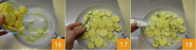 Cuando el ajo haya tomado color, colocad las patatas cortadas en rodajas al fuego 16 y coced a fuego medio durante 15 minutos, removiendo con una cuchara de madera. Añadid algunas hojas de romero para dar sabor 17 y ajustad de sal 18.