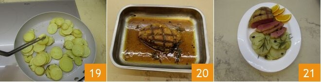 Una vez listas, eliminad el ajo con unas pinzas de cocina 19. Después de 30-35 minutos, comprobada la cocción de la carne, cortando el corazón de la pechuga con un cuchillo o verificando con una sonda: en este caso, la temperatura deberá ser de 71°; si resultase inferior, dejad el pato en el horno y volved a comprobar después de 5-10 minutos. Una vez listo 20, sacadlo del horno y emplatad: servid vuestra pechuga de pato lacada a la naranja, acompañándola con las patatas nuevas que habéis preparado y unas rodajas o gajos de naranja 21.