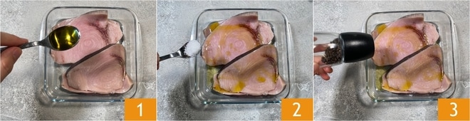 Para preparar el pez espada a la plancha comienza colocando las rodajas de pez espada en una fuente, luego condimenta con el aceite 1, la sal 2 y la pimienta 3.