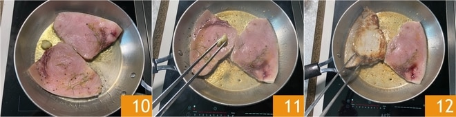 No toques el pez espada durante unos 4 minutos manteniendo el fuego medio-alto 10, de esta manera se formará una costra dorada. Retira el ajo de la sartén 11. Pasados 4 minutos, da la vuelta a las rodajas de pez espada 12.