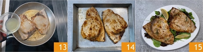 Desglasa con vino blanco 13 y cocina por otros 2 minutos, dejando evaporar completamente la parte alcohólica. Una vez cocido 14, sirve inmediatamente tu pez espada a la plancha acompañándolo con una ensaladita mixta y unas rodajas de limón 15!