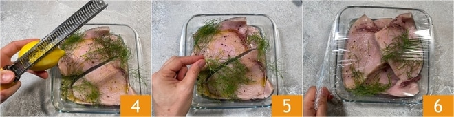 Aromatiza con la ralladura de un limón 4 y el hinojo silvestre 5. Cubre con film transparente y deja marinar en el frigorífico durante una hora 6.