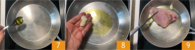 Pasado el tiempo de la marinada, calienta una sartén con un chorrito de aceite 7 y los dientes de ajo 8, luego coloca las rodajas de pez espada 9.