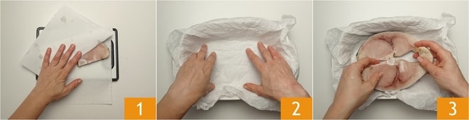 Para preparar el pez espada al horno con cocción en papillote, primero seca bien las lonchas de pez espada con papel absorbente 1. Humedece y escurre el papel de horno y colócalo en una fuente lo suficientemente grande 2, luego coloca dentro las lonchas de pez espada 3.