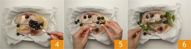 La cocción en el horno hace que el pescado sea ligero pero sabroso al mismo tiempo, gracias a la adición de un puñado de aceitunas y aromas, que liberarán sus fragancias en el papillote.