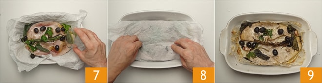 Vierte el vino blanco 7, luego cierra el papel de horno para envolver las lonchas de pescado 8. Mientras tanto, precalienta el horno con ventilación a 180°, luego hornea el pez espada durante 25 minutos. Retira la fuente del horno y activa el modo grill. Mientras tanto, elimina el papel de horno para evitar que se queme y vuelve a hornear el pez espada durante 5 minutos hasta que se dore. Deja reposar el pez espada al horno unos minutos antes de servirlo 9!
