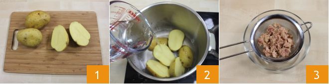 Para preparar el pez falso, empieza poniendo a hervir las patatas, sin pelar y cortadas por la mitad (de esta manera tardarán menos en cocerse), en abundante agua con sal fría durante unos 12 minutos desde que comience a hervir (1-2). Mientras tanto, escurre bien el atún utilizando un colador 3