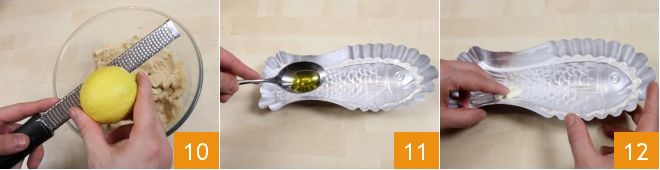 y la ralladura de medio limón 10. Mezcla bien para amalgamar todos los ingredientes y ajusta de sal y pimienta. Toma ahora un molde con forma de pez, úntalo con una cucharada de aceite 11 y una nuez de mantequilla 12,