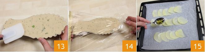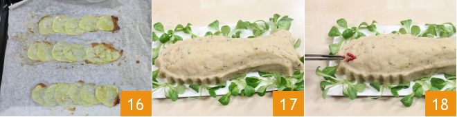 luego rellénalo con la mezcla de atún y patatas, nivelando bien la superficie 13. Coloca el molde en la nevera, cubierto con film transparente 14, y déjalo reposar por al menos 2 horas. Mientras tanto, prepara parte de la decoración: corta en rodajas muy finas una patata, lavada y pelada, luego coloca las rodajas obtenidas en una bandeja cubierta con papel de hornear, espolvoréalas con aceite y sal 15