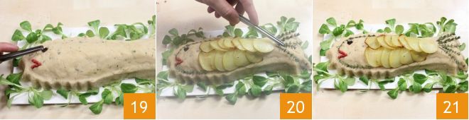 los de pimienta negra para crear el ojo 19 y las rodajas de patatas asadas para formar las escamas del pez 20. Termina colocando ramitas de tomillo para dibujar el contorno de la cabeza y decorar la cola 21. ¡Tu pez falso está listo para ser servido en la mesa: sorprenderás a tus invitados por la originalidad de la presentación!