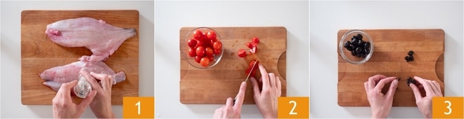 Para preparar el pez de San Pedro en sartén, lo primero que debes hacer es colocar los filetes en una tabla de cortar, sin quitarles la piel y salarlos 1. Lava bien los tomates cherry y córtalos por la mitad, o en cuartos si son demasiado grandes 2. Toma las aceitunas y deshuésalas 3.