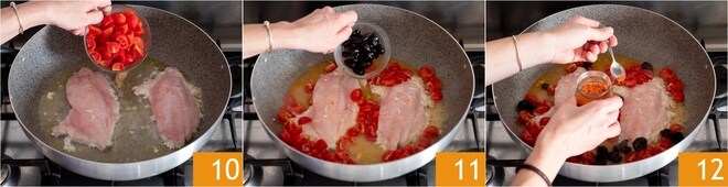 Añade ahora los tomates cherry 10, las aceitunas negras 11 y una pizca de guindilla 12.