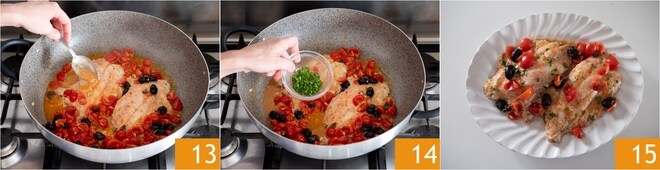 Continúa la cocción durante unos 20 minutos. No debes girar los filetes, solo verter continuamente el jugo por encima 13. Tan pronto como los filetes se vuelvan blancos, significa que están cocidos. Añade el perejil picado 14, ajusta la sal si es necesario y sírvelos 15.