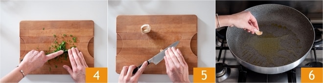 Pasa al perejil: pícalo finamente 4. Ahora aplasta el ajo, sin pelarlo, usando la hoja de un cuchillo, por el lado plano 5. En una sartén grande, vierte un chorrito de aceite, agrega un diente de ajo 6 y déjalo dorar.