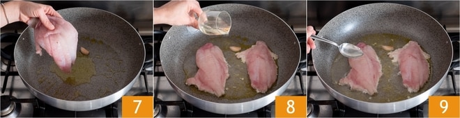 Transfiere también los filetes de pescado a la sartén, colocándolos con el lado de la piel hacia abajo 7. Cocina a fuego medio durante 5 minutos, luego desglasa con el vino blanco 8. Sin girar los filetes, vierte repetidamente el jugo sobre ellos para facilitar su cocción 9.