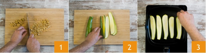 Para preparar la piadina con calabacines y stracchino, primero picad las nueces 1 y reservadlas. Lavamos bien los calabacines, los despuntamos y los cortamos en rodajas finas, con un grosor de un par de mm 2. Calentamos bien una parrilla y colocamos los calabacines encima 3.